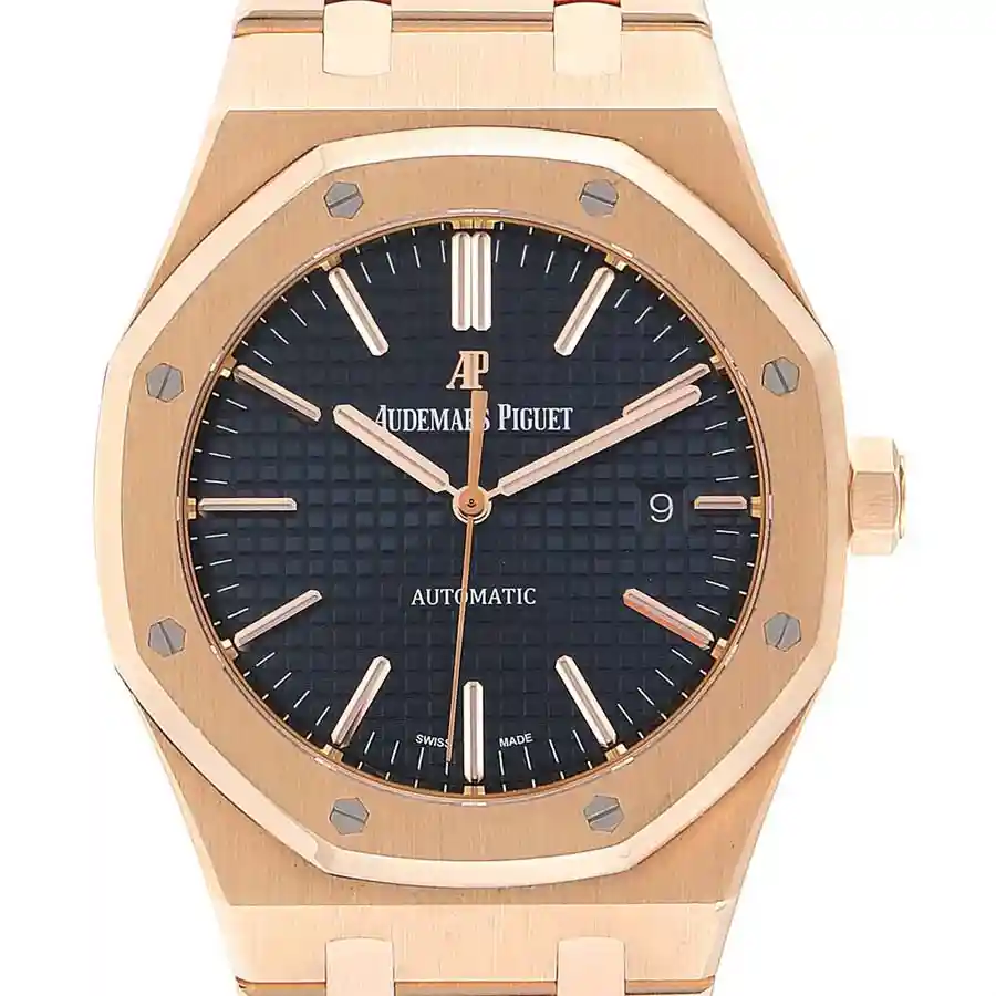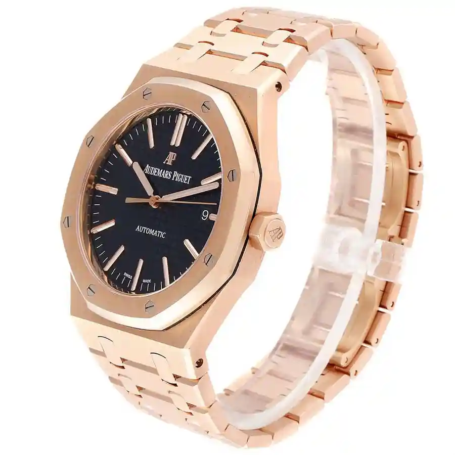 The 904L stainless steel case in rose gold color has a scratch-proof sapphire crystal and it has a 904L stainless steel bezel in rose gold color. The case has a size of 41.00 mm. There are stick and dot indices and 904L stainless steel Royal Oak hands on the black dial. It also has 904L stainless steel stick hour markers.