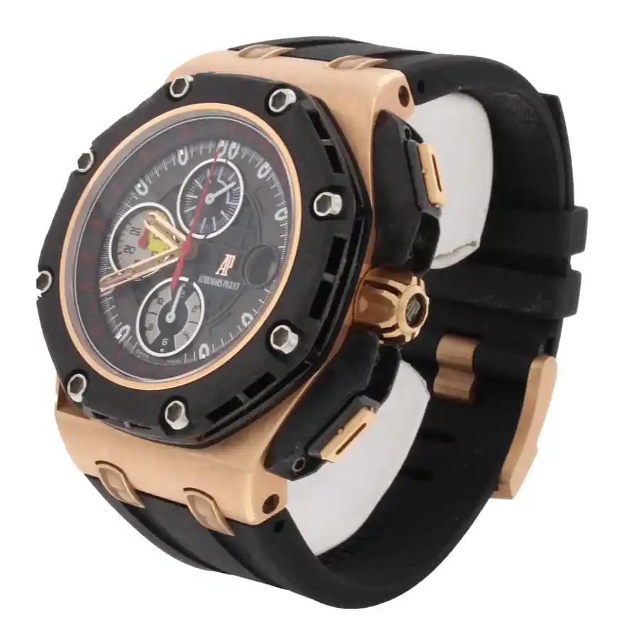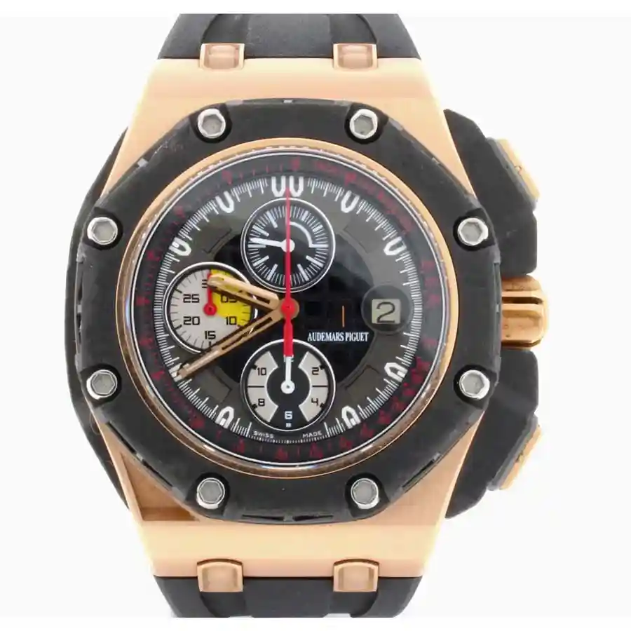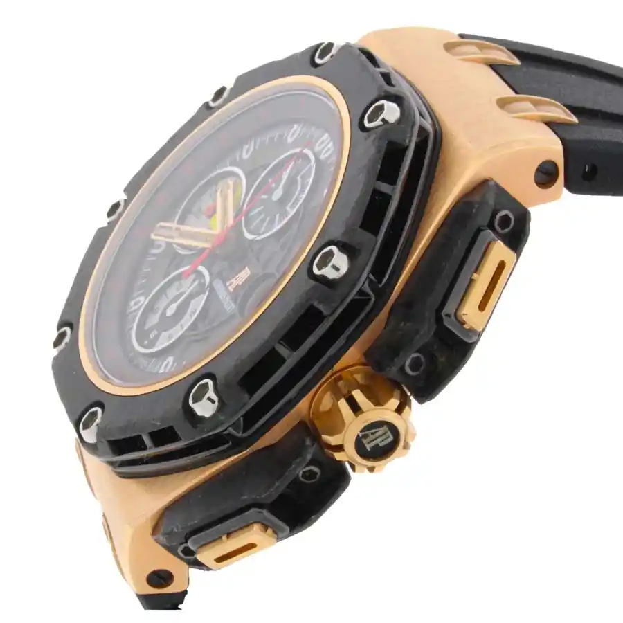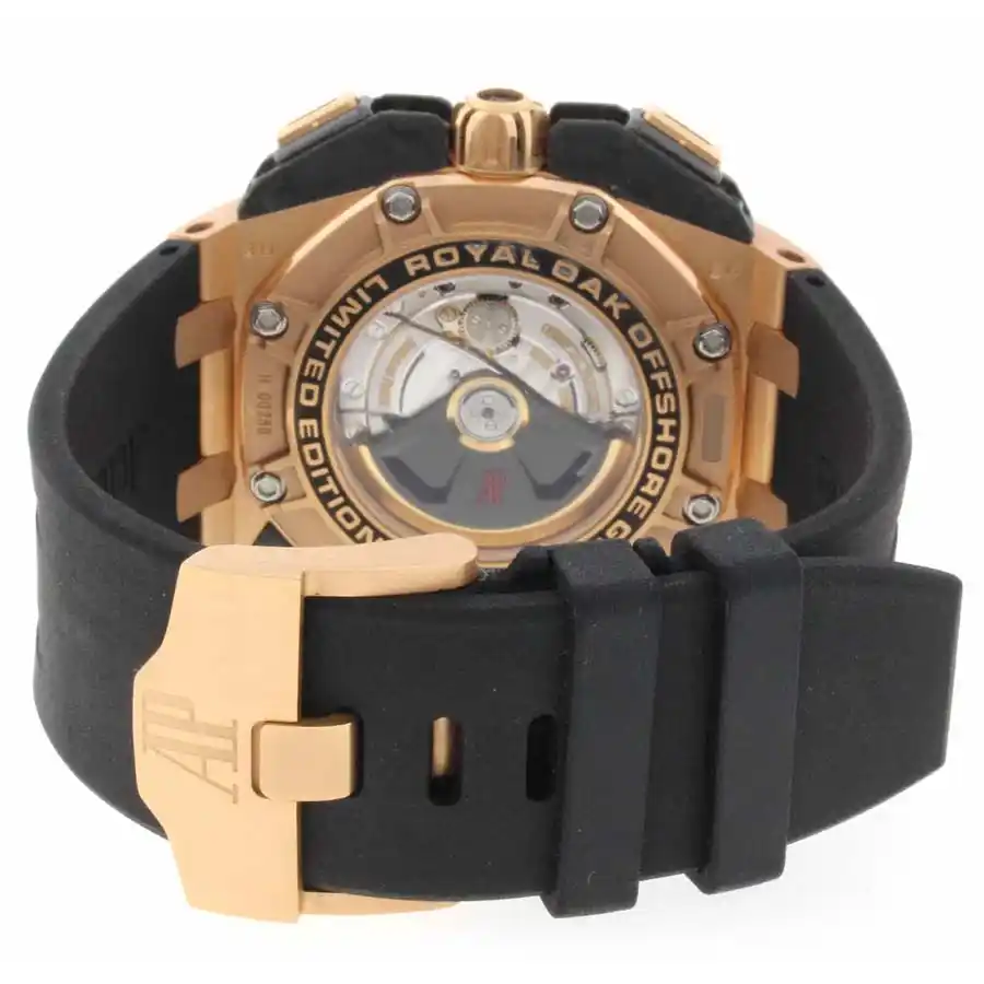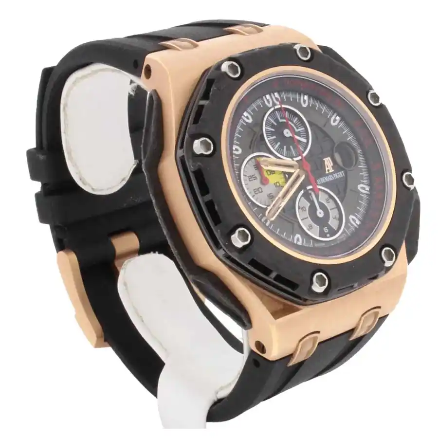 The 904L stainless steel case has a black bezel and it also has a scratch-proof sapphire crystal. The case has 44,00 mm size and 15,7 mm thickness. AP Grand Prix replica has a black rubber bracelet which is adjustable for your comfort. The bracelet has an 904L stainless steel pink gold colored AP folding clasp.