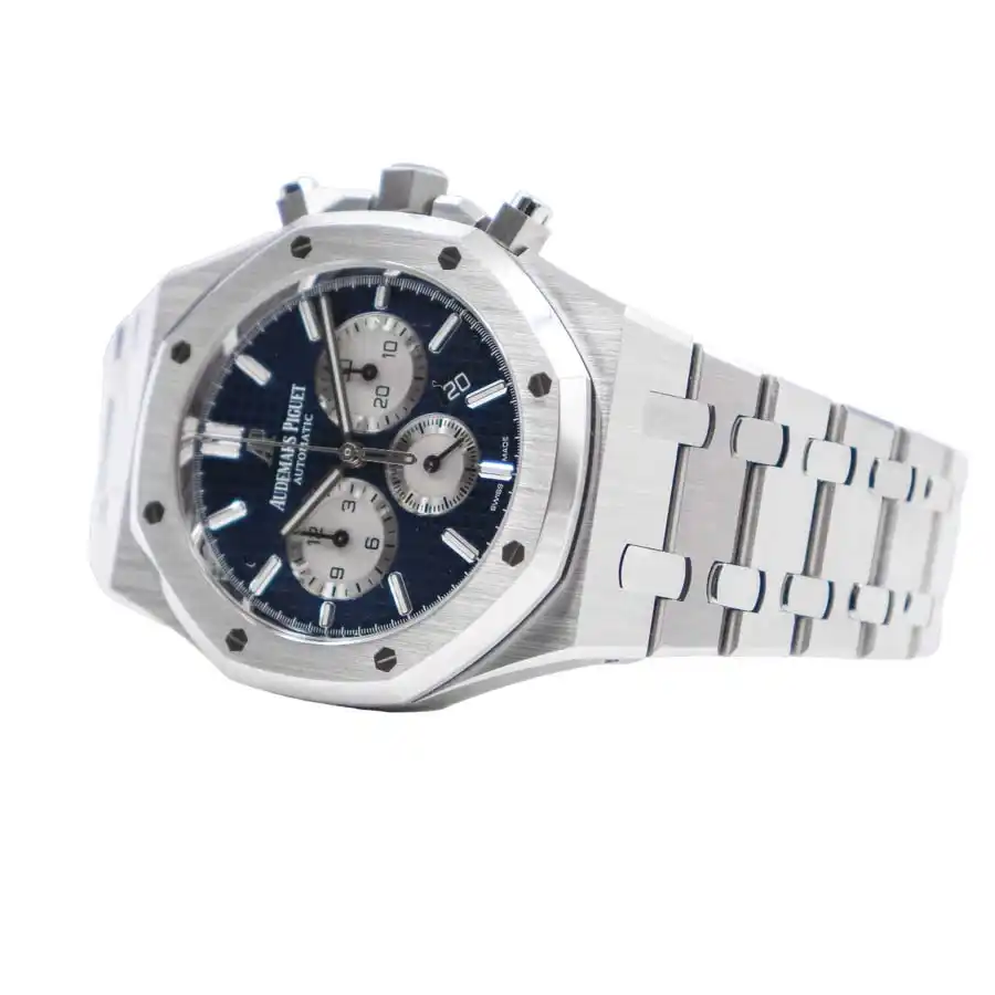 There are stick and dot indices and 904L stainless steel stick hands and Royal Oak hour markers on the blue dial.