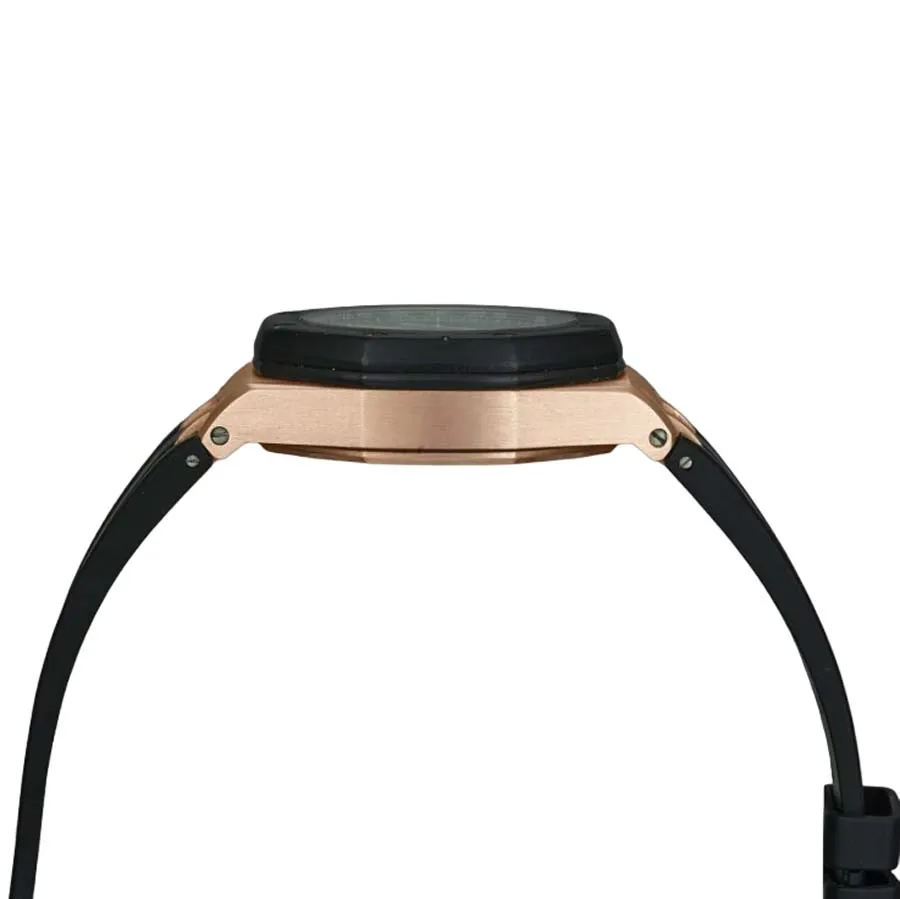It has a 904L stainless steel pink gold colored case which has a scratch-proof sapphire crystal. The case has 42,00 mm size and 14,20 mm thickness and it has a 904L stainless steel black bezel.