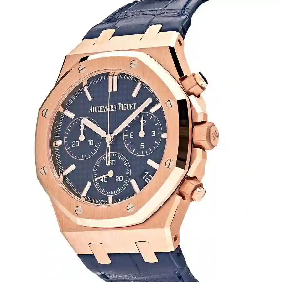 The elegant blue dial has Arabic numerals as indices and Royal Oak hour markers.