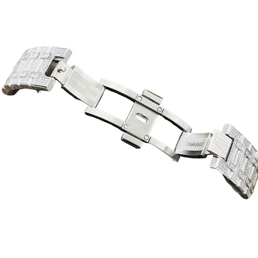 The bracelet of Audemars Piguet Iced Out Replica has adjustable links and a diamond and steel colored fold clasp.