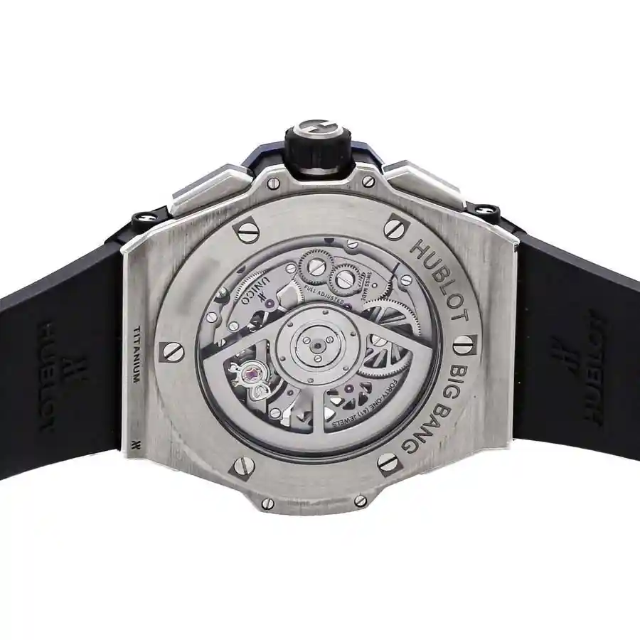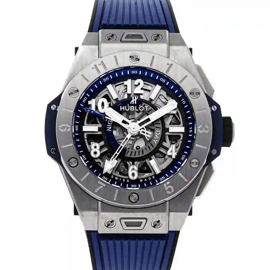 There are 904L stainless steel stick hour markers and stick hands on the blue and anthracite gray dial. The dial of Hublot Transparent Watch replica also has mixed indices.