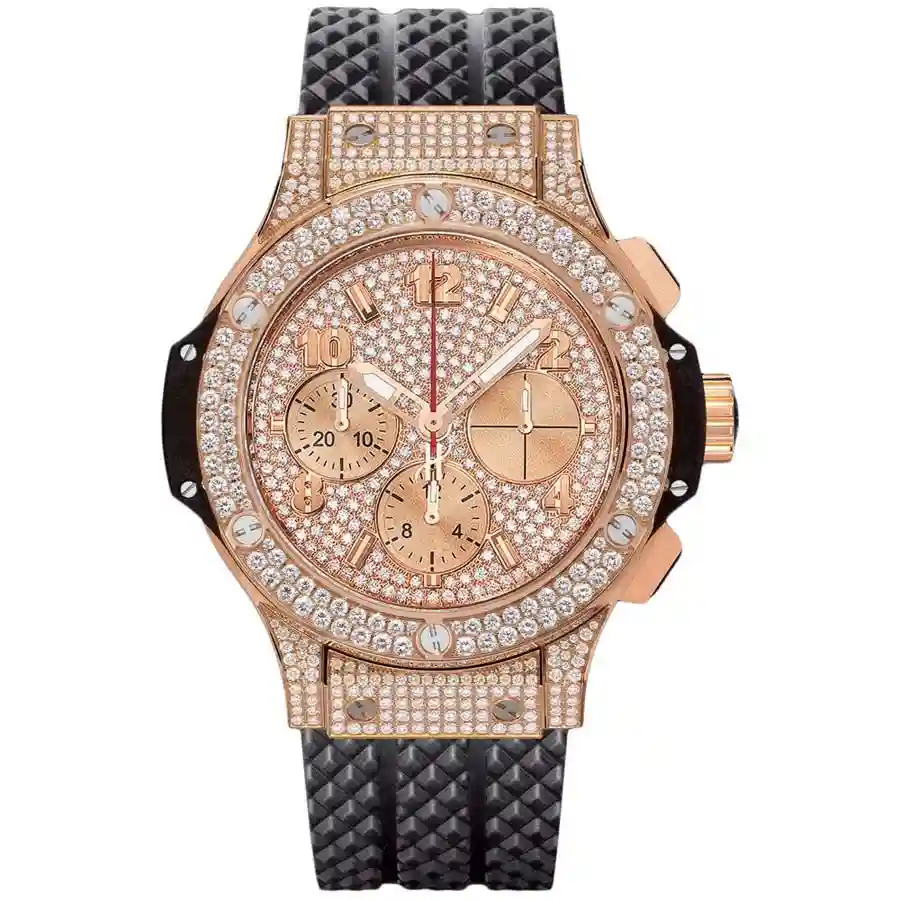 The dial is in gem-set and rose gold color. It has 904L stainless steel stick hands and stick hour markers. The dial of Hublot With Diamond replica also has mixed indices.