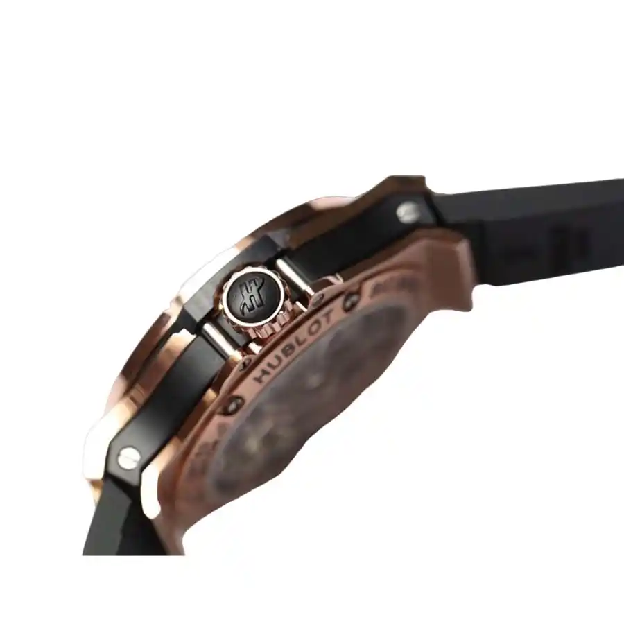 The black bracelet with adjustable links for all wrist sizes is made of top-notch rubber. It also has 904L stainless steel fold clasp in rose gold color.