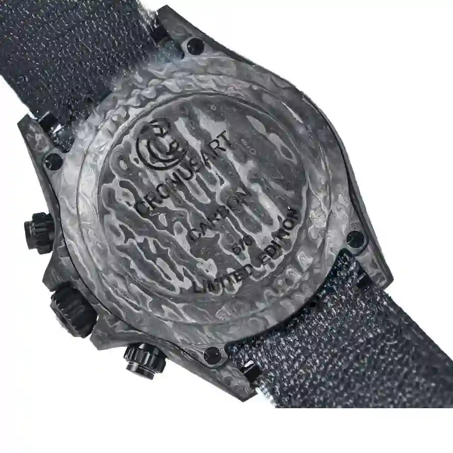 The forged carbon colored case is from 904L stainless steel. The watch also has  904L stainless steel bezel in same color and a scratch-proof sapphire crystal. The adjustable fabric bracelet provides great comfort and it elegantly wraps your wrist.